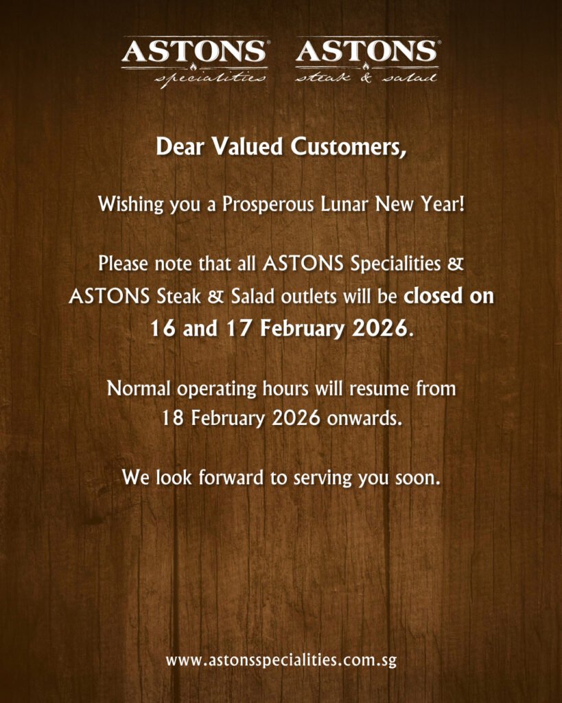ASTONS Specialities and ASTONS Steak & Salad outlets will be closed on 16 and 17 February 2026. Normal operating hours will resume from 18 February 2026 onwards.